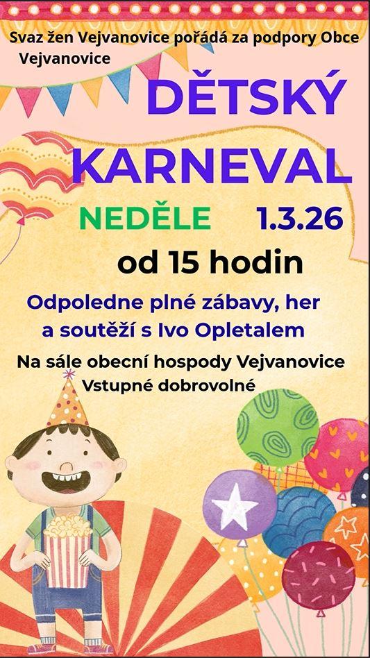 Svaz žen Vejvanovice pořádá za podpory Obce Vejvanovice v neděli 1.3.2026 od 15 hodin dětský karneval. Na sále obecní hospody Vejvanovice vás čeká odpoledne plné zábavy, her a soutěží s Ivo Opletalem. Vstupné je dobrovolné